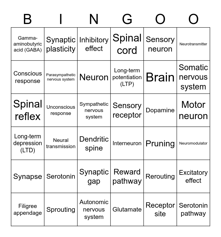 This bingo card has 40 words: Autonomic nervous system, Brain, Central nervous system (CNS), Conscious response, Interneuron, Motor neuron, Parasympathetic nervous system, Peripheral nervous system, Sensory neuron, Sensory receptor, Somatic nervous system, Spinal cord, Spinal reflex, Sympathetic nervous system, Unconscious response, Dopamine, Excitatory effect, Gamma-aminobutyric acid (GABA), Glutamate, Inhibitory effect, Neural transmission, Neuromodulator, Neuron, Neurotransmitter, Receptor site, Reward pathway, Serotonin, Serotonin pathway, Synapse, Synaptic gap, Synaptic vesicle, Dendritic spine, Filigree appendage, Long-term depression (LTD), Long-term potentiation (LTP), Pruning, Rerouting, Sprouting, Synaptic plasticity and Synaptogenesis.
