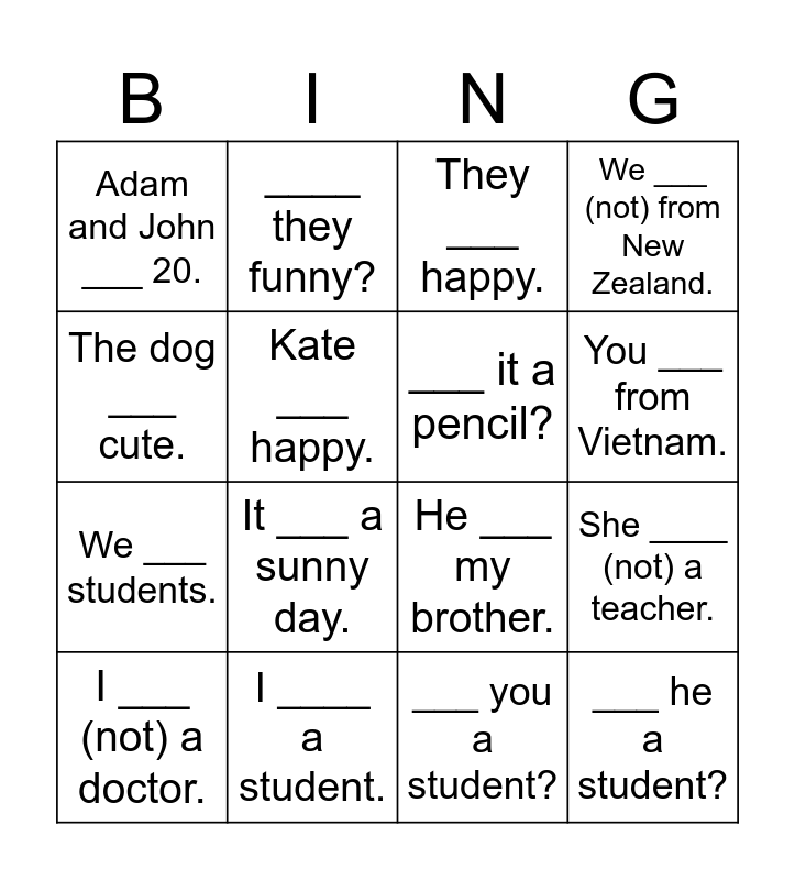 This bingo card has 16 words: I ____ a student., She ____ (not) a teacher., They ___ happy., Adam and John ___ 20., We ___ students., ____ they funny?, He ___ my brother., ___ you a student?, The dog ___ cute., Kate ___ happy., I ___ (not) a doctor., We ___ (not) from New Zealand., It ___ a sunny day., You ___ from Vietnam., ___ it a pencil? and ___ he a student?.