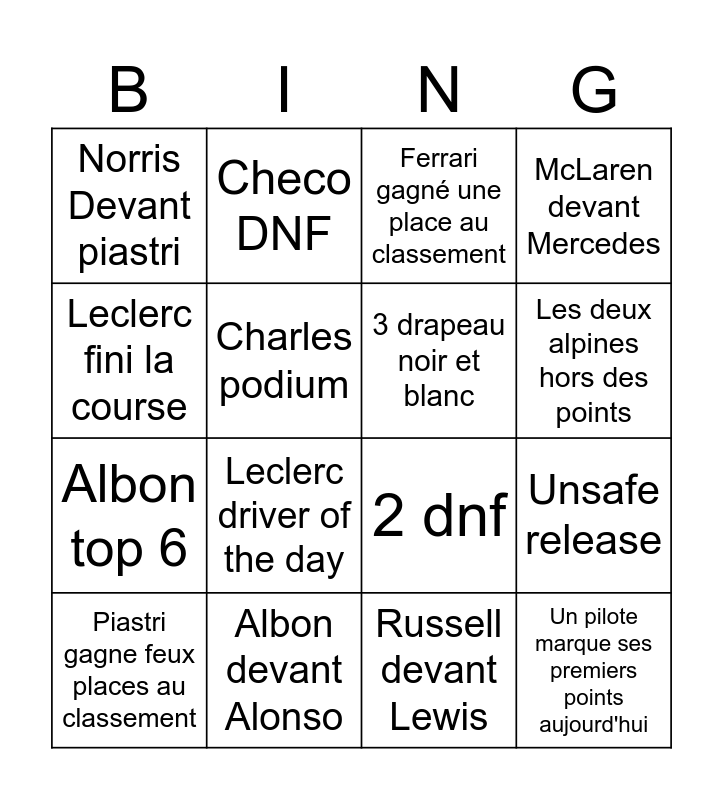 This bingo card has 26 words: Une Ferrari passe 3 tours en tete, Yuki dans les points, Les deux alpines hors des points, Drapeau jaune au premier tour, Leclerc fini la course, Norris Devant piastri, Charles podium, Checo DNF, Russell devant Lewis, Nico devant les alfa romeo, Albon top 6, 2 dnf, Safety car dans les 30 derniers tours, Accrochage stroll, Unsafe release, Ferrari long au stand, McLaren devant Mercedes, Un pilote marque ses premiers points aujourd'hui, Ferrari gagné une place au classement, Piastri gagne feux places au classement, Leclerc driver of the day, Max tour le plus rapide, Albon devant Alonso, Au moins deux sc ou vsc, 3 drapeau noir et blanc and 10 pilotes sortent large.