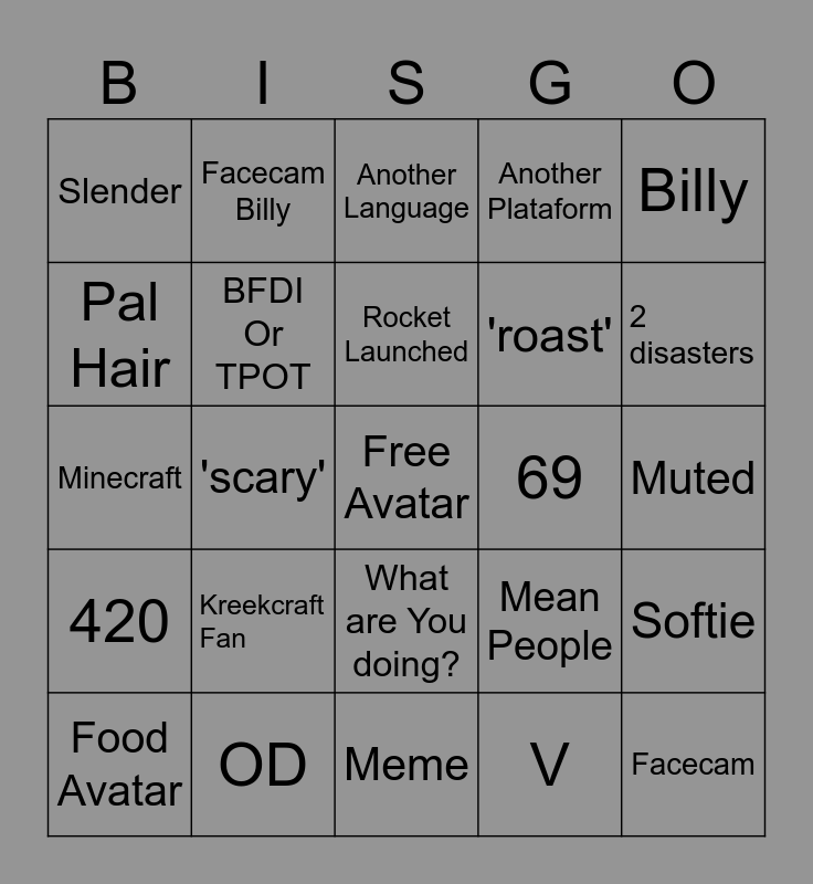 This bingo card has a free space and 24 words: Kreekcraft Fan, OD, Rocket Launched, Food Avatar, Billy, Slender, Pal Hair, Facecam Billy, 69, What are You doing?, 'roast', Minecraft, Mean People, Softie, BFDI Or TPOT, V, Muted, Another Language, 2 disasters, 'scary', Facecam, 420, Another Plataform and Meme.