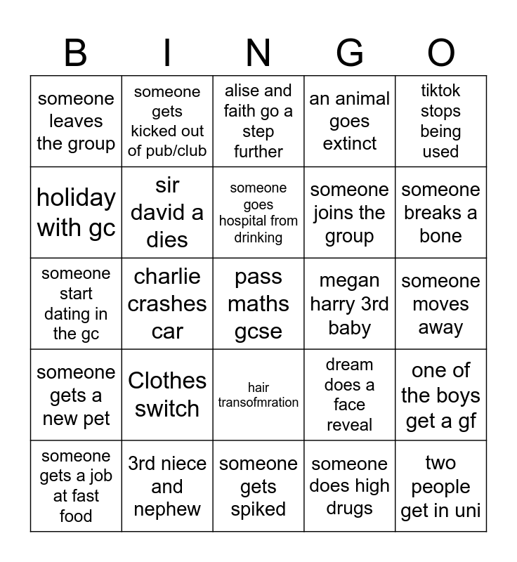 This bingo card has a free space and 24 words: Clothes switch, 3rd niece and nephew, someone goes hospital from drinking, someone gets a job at fast food, tiktok stops being used, someone leaves the group, holiday with gc, someone gets kicked out of pub/club, megan harry 3rd baby, hair transofmration, someone joins the group, someone start dating in the gc, dream does a face reveal, one of the boys get a gf, sir david a dies, someone does high drugs, someone moves away, alise and faith go a step further, someone breaks a bone, charlie crashes car, two people get in uni, someone gets a new pet, an animal goes extinct and someone gets spiked.
