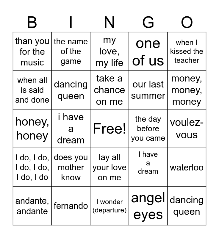 This bingo card has a free space and 34 words: the winner takes it all, angel eyes, gimme! gimme! gimme!, why did it have to be me?, I do, I do, I do, I do, I do, I do, dancing queen, when I kissed the teacher, andante, andante, the name of the game, kisses of fire, take a chance on me, my love, my life, Mamma Mia, I've been waiting on you, the day before you came, money, money, money, fernando, honey, honey, does you mother know, I have a dream, lay all your love on me, super trouper, than you for the music, voulez-vous, I wonder (departure), dancing queen, one of us, knowing me, knowing you, our last summer, when all is said and done, slipping through my fingers, i have a dream, waterloo and sos.