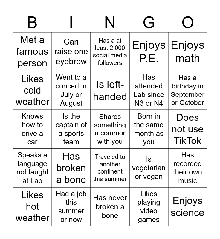 This bingo card has a free space and 34 words: Has two or more siblings, Likes playing video games, Plays an instrument, Has lived outside Illinois or Indiana, Speaks a language not taught at Lab, Went to a concert in July or August, Enjoys math, Likes hot weather, Can raise one eyebrow, Has two pets, Is left-handed, Has a at least 2,000 social media followers, Enjoys baking, Is visibly wearing something white, Born in the same month as you, Has a birthday in September or October, Had a job this summer or now, Knows how to drive a car, Has broken a bone, Is vegetarian or vegan, Traveled to another continent this summer, Lives less than one mile from school, Met a famous person, Does not use TikTok, Has never broken a bone, Enjoys science, Enjoys P.E., Has no siblings, Has attended Lab since N3 or N4, Likes cold weather, Is the president of a club, Is the captain of a sports team, Has recorded their own music and Is a morning person.