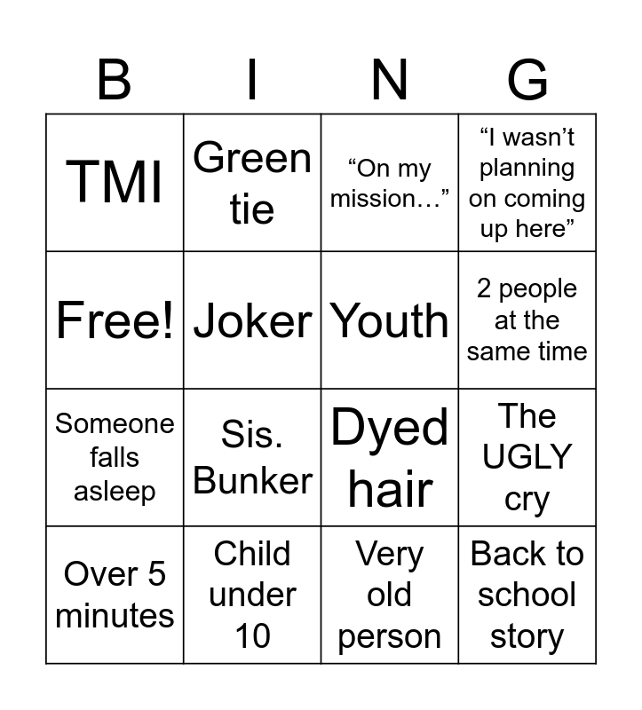 This bingo card has 16 words: Child under 10, The UGLY cry, “On my mission…”, TMI, Someone falls asleep, Green tie, Dyed hair, Very old person, Free!, Joker, Over 5 minutes, “I wasn’t planning on coming up here”, Sis. Bunker, 2 people at the same time, Youth and Back to school story.