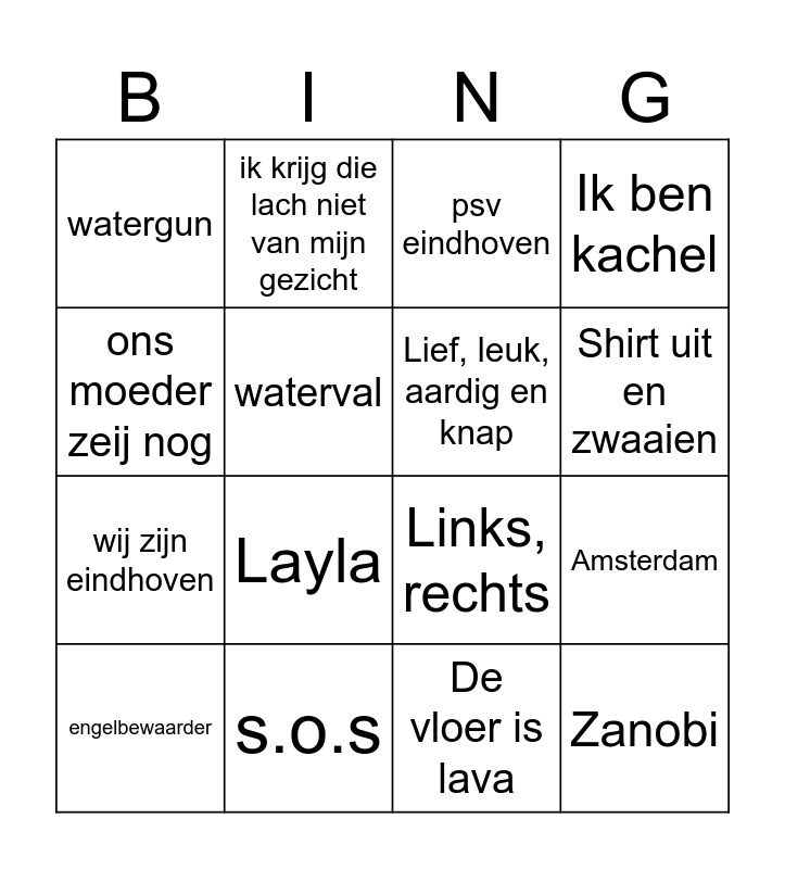 This bingo card has 20 words: Amsterdam, automatisch, psv eindhoven, drie kleine kleutertjes, engelbewaarder, ons moeder zeij nog, s.o.s, watergun, wij zijn eindhoven, ik krijg die lach niet van mijn gezicht, Layla, Links, rechts, waterval, Zanobi, Lief, leuk, aardig en knap, hoofd, schouders, knie en teen, Shirt uit en zwaaien, Ik ben kachel, De vloer is lava and Pinguindans.
