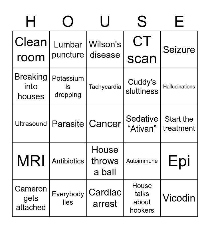 This bingo card has 36 words: Intubate, Lupus, Cardiomyopathy, Potassium is dropping, Autoimmune, MRI, Tachycardia, Arythmia, Seizure, Meningitis, Parasite, CT scan, Tumor, Sedative “Ativan”, Hallucinations, Clean room, Vicodin, Antibiotics, Cancer, Wilson's disease, Start the treatment, Epi, Everybody lies, Cameron gets attached, Cardiac arrest, Lumbar puncture, Ultrasound, Chase is rich, Cuddy’s sluttiness, Breaking into houses, Foreman’s Blackness, Bone Marrow Biopsy, House talks about hookers, House throws a ball, Wilson’s adultery and Patient spiked a fever.