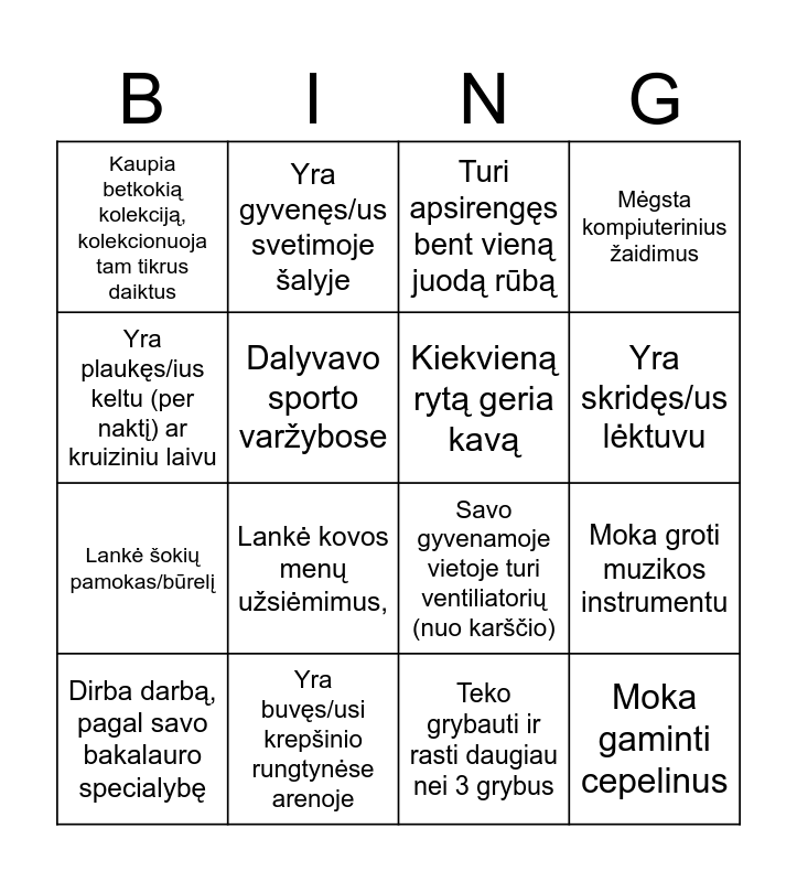 This bingo card has 48 words: Yra aplankęs/ius 5 ar daugiau šalių, Dirba darbą, pagal savo bakalauro specialybę, Yra skridęs/us oro balionu, Turi bent vieną nuosavą gyvūną, Moka kalbėti svetima kalba, Turi tatuiruotę, Yra gyvenęs/us svetimoje šalyje, Nešioja laikrodį, Dalyvavo sporto varžybose, Yra dalyvavęs/us tikram reive, Kiekvieną rytą geria kavą, Mėgsta kompiuterinius žaidimus, Viena/s iškeliavęs į kitą šalį atostogauti,, Turi magistro laipsnį, Yra savanoriavęs/us betkokioje organizacijoje ar veikloje, Yra buvęs Kryžių Kalne, Yra skridęs/us lėktuvu, Yra buvęs/usi krepšinio rungtynėse arenoje, Tarnavo kariuomenėje, Yra plaukęs/ius keltu (per naktį) ar kruiziniu laivu, Moka groti muzikos instrumentu, Yra tekę dalyvauti kino festivalyje, Kaupia betkokią kolekciją, kolekcionuoja tam tikrus daiktus, Lankė šokių pamokas/būrelį, Bent kartą į savaitę medituoja ar meditavo, Lankė kovos menų užsiėmimus,, Yra užraugęs/usi namimio vyno ar kito spiritinio gėrimo, Yra buvęs/usi teatre, Yra dalyvavęs stand-up pasirodyme, Moka gaminti cepelinus, Yra plaukęs/iusi baidarėmis upe, Aktyviai vykdo sportinę veiklą, Yra jojęs/usi arkliu, Per paskutinius 10 metų pilnai perskaitęs/čius bent 2 knygas, Yra gyvenęs/us "barake", Yra matęs/čius krentančią žvaigždę, Yra beisparkuodama/s įbrežęs/us automobilį, Teko grybauti ir rasti daugiau nei 3 grybus, Yra, vienaip ar kitaip buvęs/us apscamintu/a, Yra nusipirkęs/us sąlyginai brangią prekę ir po to gailėjesis/usis, Yra iš pykčio sudaužęs/iusi telefoną/ monitorių/ laptopą, Laiko rankose pieštuką, Turi apsirengęs bent vieną juodą rūbą, Savo kraujyje turi bent lašelį alkoholio, Savo gyvenamoje vietoje turi ventiliatorių (nuo karščio), Mano, kad laikas išgerti, Yra sapnavęs/us mokyklą and Yra sapnavęs/usi bent vieną iš bendraklasių..