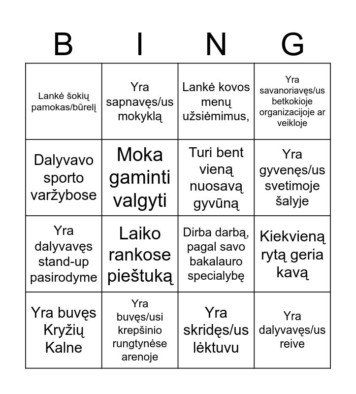 This bingo card has 40 words: Yra aplankęs/ius 2 ar daugiau šalių, Dirba darbą, pagal savo bakalauro specialybę, Yra skridęs/us oro balionu, Turi bent vieną nuosavą gyvūną, Moka kalbėti svetima kalba, Turi tatuiruotę, Yra gyvenęs/us svetimoje šalyje, Nešioja laikrodį, Dalyvavo sporto varžybose, Yra dalyvavęs/us reive, Kiekvieną rytą geria kavą, Yra savanoriavęs/us betkokioje organizacijoje ar veikloje, Yra buvęs Kryžių Kalne, Yra skridęs/us lėktuvu, Yra buvęs/usi krepšinio rungtynėse arenoje, Moka groti muzikos instrumentu, Kaupia betkokią kolekciją, kolekcionuoja tam tikrus daiktus, Lankė šokių pamokas/būrelį, Bent kartą į savaitę medituoja ar meditavo, Lankė kovos menų užsiėmimus,, Yra užraugęs/usi namimio vyno ar kito spiritinio gėrimo, Yra buvęs/usi teatre, Yra dalyvavęs stand-up pasirodyme, Moka gaminti valgyti, Yra plaukęs/iusi baidarėmis upe, Aktyviai vykdo sportinę veiklą, Yra jojęs/usi arkliu, Per paskutinius 10 metų pilnai perskaitęs/čius bent 2 knygas, Yra gyvenęs/us "barake", Yra matęs/čius krentančią žvaigždę, Yra beisparkuodama/s įbrežęs/us automobilį, Teko grybauti ir rasti daugiau nei 3 grybus, Yra, vienaip ar kitaip buvęs/us apscamintu/a, Yra iš pykčio sudaužęs/iusi telefoną/ monitorių/ laptopą, Laiko rankose pieštuką, Turi apsirengęs bent vieną juodą rūbą, Savo kraujyje turi bent lašelį alkoholio, Mano, kad laikas išgerti, Yra sapnavęs/us mokyklą and Yra sapnavęs/usi bent vieną iš bendraklasių..