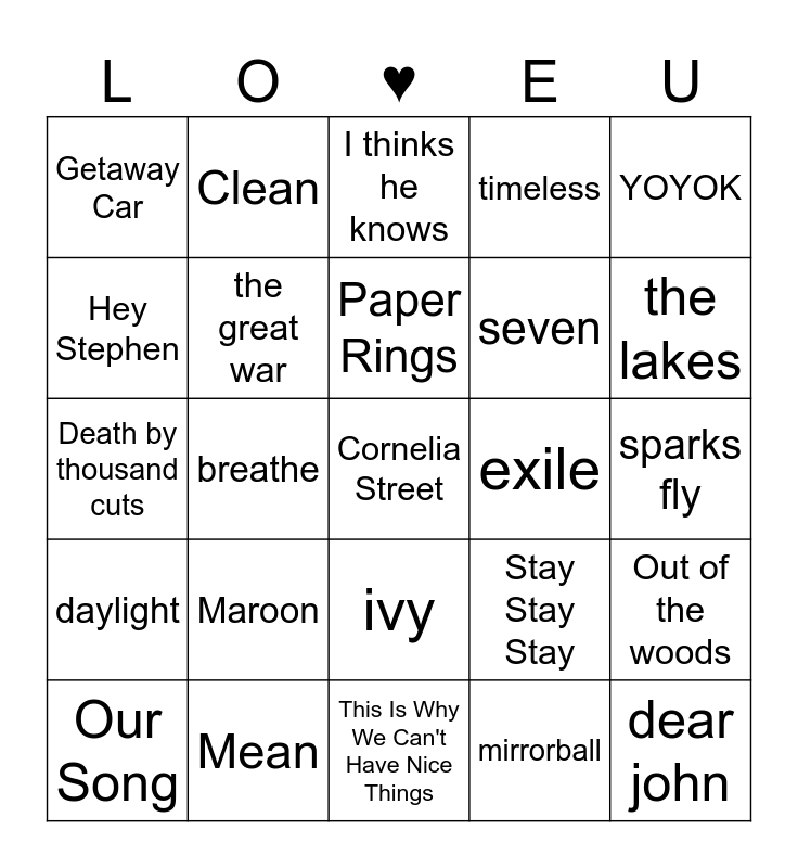 This bingo card has a free space and 24 words: Maroon, Mean, Paper Rings, Our Song, YOYOK, Getaway Car, Hey Stephen, Clean, exile, ivy, seven, Death by thousand cuts, Stay Stay Stay, Out of the woods, the great war, mirrorball, sparks fly, I thinks he knows, the lakes, breathe, dear john, daylight, timeless and This Is Why We Can't Have Nice Things.