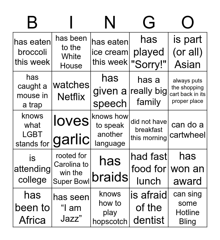 This bingo card has 29 words: has been to Africa, was born in the Midwest, loves garlic, can sing some Hotline Bling, has eaten broccoli this week, has eaten ice cream this week, watches Netflix, rooted for Carolina to win the Super Bowl, did not have breakfast this morning, has seen “I am Jazz”, can do a cartwheel, knows how to speak another language, knows how to play hopscotch, is afraid of the dentist, always puts the shopping cart back in its proper place, was born before 1970, has braids, is attending college, is part (or all) Asian, knows what LGBT stands for, had fast food for lunch, has been to Tony Ferraiolo’s group, has a really big family, has caught a mouse in a trap, has played "Sorry!", has been to the White House, has won an award, has given a speech and can make Mexican food.
