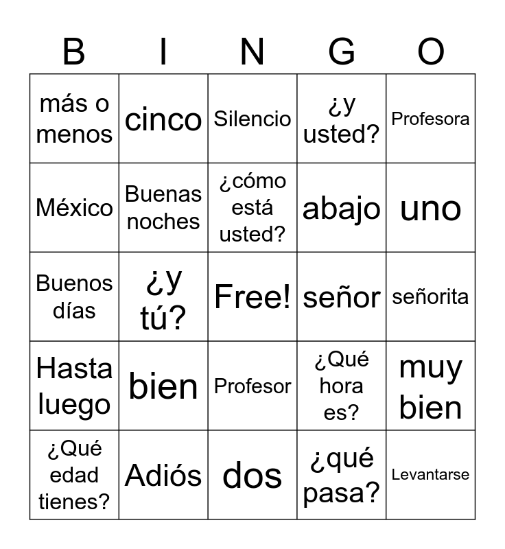 This bingo card has 40 words: Clase de español, Buenos días, Buenas tardes, Buenas noches, Adiós, Profesor, ¿cómo está usted?, Hasta mañana, Profesora, Hasta luego, ¿y tú?, ¿y usted?, Free!, señorita, señor, bien, arriba, más o menos, mal, Silencio, muy bien, ¿qué pasa?, abajo, México, Costa Rica, Izquierda, derecha, Sentarse, Levantarse, aplausos, ¿Qué hora es?, ¿Qué edad tienes?, ¿Cúantos ańos tienes?, ¿Qué hora es?, uno, dos, tres, cuatro, cinco and seis.