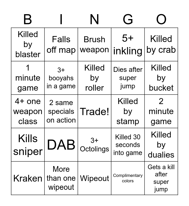 This bingo card has a free space and 24 words: DAB, More than one wipeout, Killed by roller, Kraken, Killed by crab, Killed by blaster, 1 minute game, Falls off map, Killed by stamp, 3+ Octolings, Dies after super jump, 4+ one weapon class, Killed 30 seconds into game, Killed by dualies, 3+ booyahs in a game, Complimentary colors, 2 minute game, Brush weapon, Killed by bucket, 2 same specials on action, Gets a kill after super jump, Kills sniper, 5+ inkling and Wipeout.