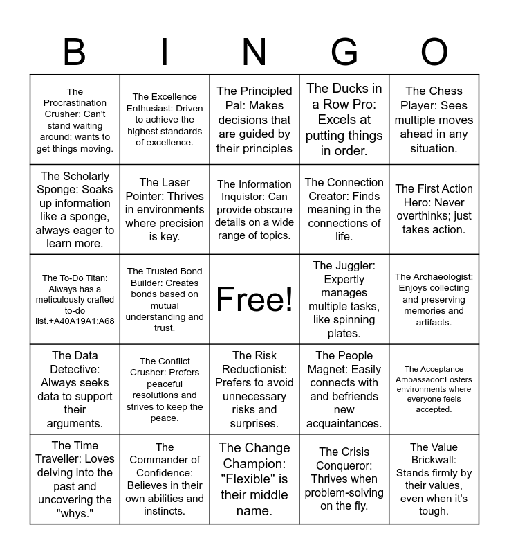 This bingo card has a free space and 102 words: The Excited Seer: Plans for the distant future with enthusiasm., The History Buff: Connects historical events to modern situations., The Chess Player: Sees multiple moves ahead in any situation., The Non Wallflower: Has a strong presence in any room., The To-Do Sniper: Zones in on tasks without distractions., The Real Connection Creator: Prefers deep, meaningful relationships over superficial ones., The Productivity Pro: Finds immense satisfaction in ticking off completed tasks., The Inspirational Influencer: Aspires to inspire and leave a lasting legacy., The Orchestrator: Loves organizing gatherings and making sure everything runs smoothly., The Goal Getter: Thrives on that feeling of accomplishment after reaching a goal., The Balance Bringer: Seeks common ground in disagreements., The Fix-It Fanatic: Enjoys repairing and improving processes and systems., The Cautious Contemplator: Plans for contingencies and worst-case scenarios., The Natural Networker: Thrives in social situations and enjoys making connections., The Problem-Solving Prodigy: Excels at finding solutions to complex issues., The Challenge Champion: Can't resist turning even casual games into fierce competitions., The Data Detective: Always seeks data to support their arguments., The Perfection Pursuer: Seeks to optimize and enhance existing strengths., The Eternal Student: Always seeking opportunities to gain new knowledge and skills., The Inquisitive Mind: Asks "why" about everything., The Potential Polisher: Takes pride in helping people develop their skills., The Thought Explorer: Enjoys exploring the vast landscape of ideas and possibilities., The Inclusivity Influencer: Makes sure no one feels left out or overlooked., The Optimization Overlord: Knows how to make the best even better., The Charismatic Chatterbox: Can win others over with their charm and enthusiasm., The First Action Hero: Never overthinks; just takes action., The Ducks in a Row Pro: Excels at putting things in order., The Conflict Crusher: Prefers peaceful resolutions and strives to keep the peace., The Knowledge Collector: Loves acquiring and hoarding interesting information., The Accountability Ace: Owns up to mistakes and learns from them., The Excellence Enthusiast: Driven to achieve the highest standards of excellence., The Principled Pal: Makes decisions that are guided by their principles, The Efficiency Expert: Approaches tasks with order and efficiency, The Ruler of Routine: Thrives when things are predictable and orderly., The Winning Warrior: Thrives on friendly contests and strives to win., The Risk Reductionist: Prefers to avoid unnecessary risks and surprises., The Wordsmith: Can turn a simple idea into a captivating story., The Plan B Builder: Easily shifts gears when the original plan falls apart., The To-Do Titan: Always has a meticulously crafted to-do list.+A40A19A1:A68, The Crisis Conqueror: Thrives when problem-solving on the fly., The Solutions Architect: Thinks critically to solve complex problems., The Fact Finder: Enjoys sharing intriguing facts and trivia with others., The Time Traveller: Loves delving into the past and uncovering the "whys.", The Tomorrow's Trailblazer: Enjoys exploring ideas and possibilities., The Heart Driven Helper: Feels deeply attuned to the emotions of others., The Visionary Voyager: Always thinking about what the future might hold., The Decision Defender: Always thinks twice (or more) before making a decision., The Connection Creator: Finds meaning in the connections of life., The Royal of Recognition: Values acknowledgment and validation for their work., The Brainstorming Buddy: Sparks innovative thinking in others., The Curiousity Connoisseur: Thrives in environments that challenge and stimulate the mind., The Innovation Instigator: Constantly brainstorming creative solutions and concepts., The Scholarly Sponge: Soaks up information like a sponge, always eager to learn more., The Smooth Talker: Always has a way with words, even in challenging conversations., The Sunshine Spreader: Radiates optimism and lifts others' spirits., The Order Overlord: Thrives on structure and organization in both work and life., The Victory Viscount: Loves basking in the glory of a hard-fought win., The Bold Believer: Trusts their decisions, even when others doubt them., The Philosophical Ponderer: Finds joy in pondering complex questions and mysteries., The Value Brickwall: Stands firmly by their values, even when it's tough., The Logic Lover: Finds comfort in spreadsheets and statistics., The Thoughtful Theorist: Constantly delves into the depths of their own thoughts., The Strategy Sorcerer: Excels at developing well-thought-out strategies., The Happiness Harbinger: Finds happiness in the little things and shares it with others., The Dependable Rock: Takes obligations seriously and always follows through., The Growth Guru: Sees the beauty in growth and improvement., The Enthusiastic Instigator: Loves jumping into new projects with enthusiasm., The Archaeologist: Enjoys collecting and preserving memories and artifacts., The Trusted Bond Builder: Creates bonds based on mutual understanding and trust., The Commander of Confidence: Believes in their own abilities and instincts., The Compassion Crusader: Provides a listening ear and a shoulder to lean on., The Diversity Dynamo: Values and welcomes people of all backgrounds., The Objective Obsessor: Once pointed at a task, gives it undivided attention, The Bridge Builder: Strives to bring people together and build bridges., The Distinctiveness Discoverer: Helps people see the strengths in their distinct traits., The Champion of Clarity: Makes complex topics easy for everyone to understand., The Laser Pointer: Thrives in environments where precision is key., The Straight Shooter: Doesn't mince words and tells it like it is., The Smilesmith: Believes there's a silver lining in every situation., The Abstract Analyzer: Enjoys exp