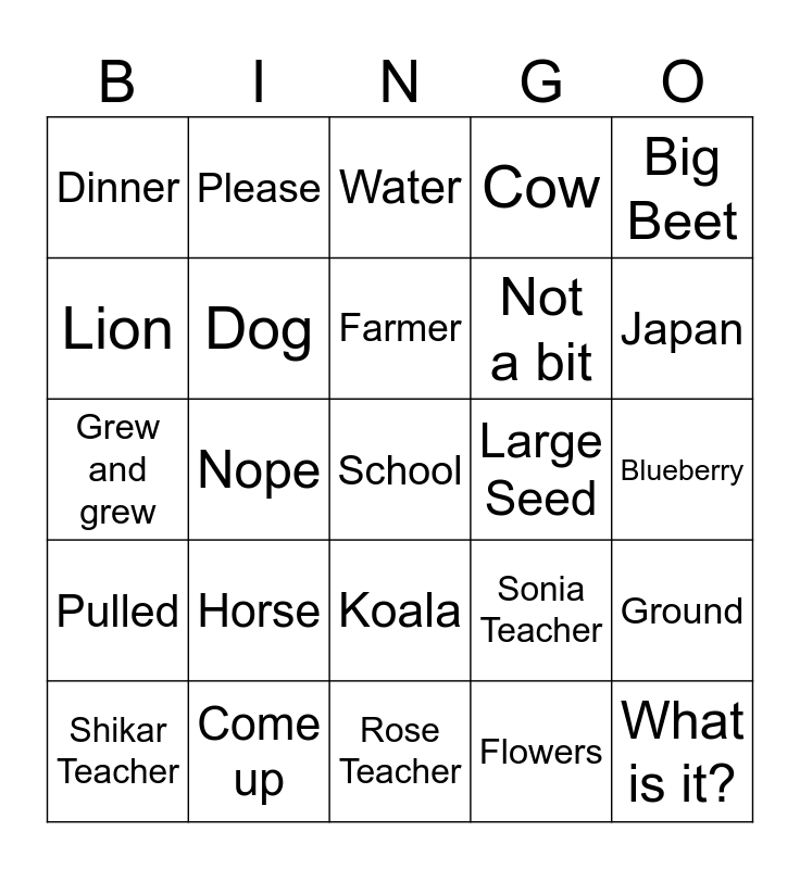 This bingo card has 25 words: Horse, Rose Teacher, Farmer, Shikar Teacher, Big Beet, Dinner, Lion, Please, Large Seed, Koala, Not a bit, Grew and grew, Sonia Teacher, Ground, Dog, What is it?, Blueberry, Water, Japan, Nope, School, Come up, Pulled, Cow and Flowers.