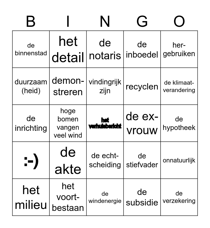 This bingo card has a free space and 24 words: de akte, het voort-bestaan, vindingrijk zijn, het milieu, her-gebruiken, de binnenstad, duurzaam (heid), het detail, de ex-vrouw, de echt- scheiding, recyclen, de inrichting, de stiefvader, onnatuurlijk, demon-streren, de subsidie, de hypotheek, de notaris, de klimaat-verandering, hoge bomen vangen veel wind, de verzekering, :-), de inboedel and de windenergie.