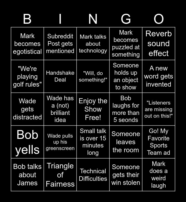 This bingo card has a free space and 24 words: Wade pulls up his greenscreen, Triangle of Fairness, "Will, do something!", Bob talks about James, Reverb sound effect, Mark becomes egotistical, "We're playing golf rules", Subreddit Post gets mentioned, Bob laughs for more than 5 seonds, Small talk is over 15 minutes long, Someone holds up an object to show, Wade gets distracted, Someone leaves the room, Go! My Favorite Sports Team ad, Handshake Deal, Someone gets their win stolen, "Listeners are missing out on this!", Mark talks about technology, A new word gets invented, Wade has a (not) brilliant idea, Mark does a weird laugh, Bob yells, Mark becomes puzzled at something and Technical Difficulties.