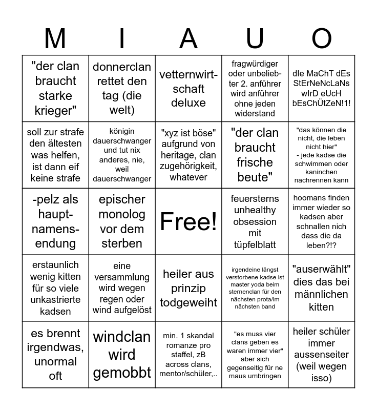 This bingo card has a free space and 24 words: eine versammlung wird wegen regen oder wind aufgelöst, windclan wird gemobbt, "xyz ist böse" aufgrund von heritage, clan zugehörigkeit, whatever, es brennt irgendwas, unormal oft, dIe MaChT dEs StErNeNcLaNs wIrD eUcH bEsChÜtZeN!1!, "der clan braucht starke krieger", soll zur strafe den ältesten was helfen, ist dann eif keine strafe, donnerclan rettet den tag (die welt), feuersterns unhealthy obsession mit tüpfelblatt, heiler aus prinzip todgeweiht, "der clan braucht frische beute", -pelz als haupt- namens-endung, irgendeine längst verstorbene kadse ist master yoda beim sternenclan für den nächsten prota/im nächsten band, "auserwählt" dies das bei männlichen kitten, königin dauerschwanger und tut nix anderes, nie, weil dauerschwanger, "es muss vier clans geben es waren immer vier" aber sich gegenseitig für ne maus umbringen, hoomans finden immer wieder so kadsen aber schnallen nich dass die da leben?!?, vetternwirt-schaft deluxe, "das können die nicht, die leben nicht hier" - jede kadse die schwimmen oder kaninchen nachrennen kann, epischer monolog vor dem sterben, heiler schüler immer aussenseiter (weil wegen isso), erstaunlich wenig kitten für so viele unkastrierte kadsen, fragwürdiger oder unbelieb-ter 2. anführer wird anführer ohne jeden widerstand and min. 1 skandal romanze pro staffel, zB across clans, mentor/schüler,...
