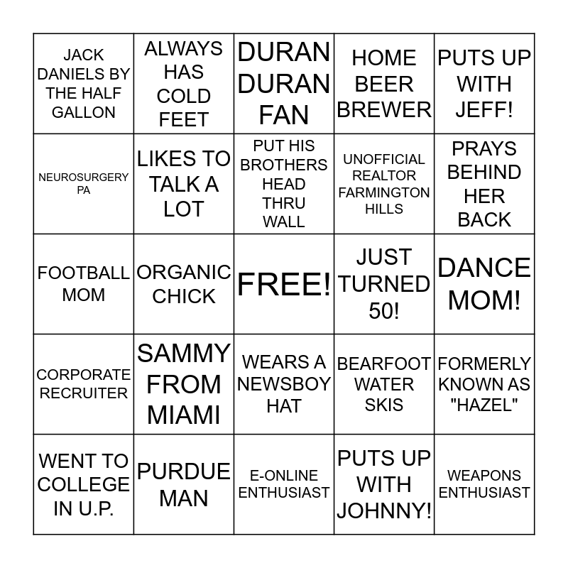 This bingo card has a free space and 24 words: SAMMY FROM MIAMI, PURDUE MAN, PUT HIS BROTHERS HEAD THRU WALL, WENT TO COLLEGE IN U.P., PUTS UP WITH JEFF!, JACK DANIELS BY THE HALF GALLON, NEUROSURGERY PA, ALWAYS HAS COLD FEET, JUST TURNED 50!, WEARS A NEWSBOY HAT, UNOFFICIAL REALTOR FARMINGTON HILLS, FOOTBALL MOM, BEARFOOT WATER SKIS, FORMERLY KNOWN AS "HAZEL", LIKES TO TALK A LOT, PUTS UP WITH JOHNNY!, DANCE MOM!, DURAN DURAN FAN, PRAYS BEHIND HER BACK, ORGANIC CHICK, WEAPONS ENTHUSIAST, CORPORATE RECRUITER, HOME BEER BREWER and E-ONLINE ENTHUSIAST.