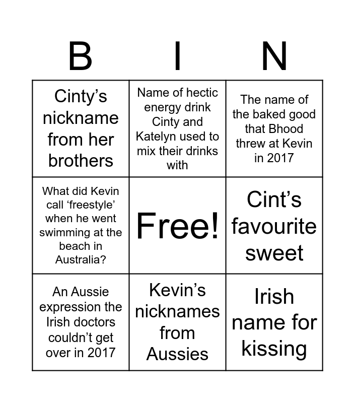This bingo card has a free space and 8 words: Cint’s favourite sweet, The name of the baked good that Bhood threw at Kevin in 2017, Name of hectic energy drink Cinty and Katelyn used to mix their drinks with, An Aussie expression the Irish doctors couldn’t get over in 2017, Cinty’s nickname from her brothers, Irish name for kissing, What did Kevin call ‘freestyle’ when he went swimming at the beach in Australia? and Kevin’s nicknames from Aussies.