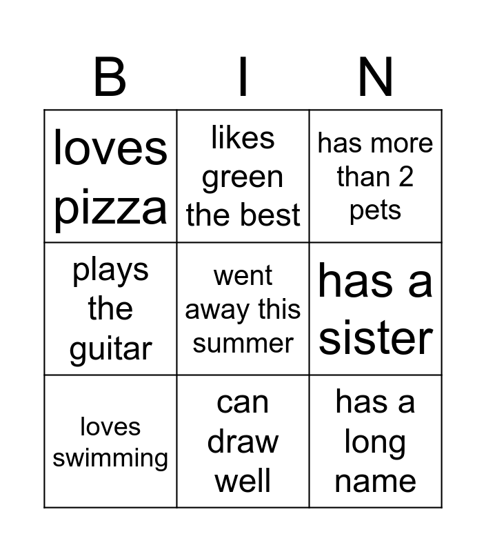 This bingo card has a free space and 8 words: has a sister, has more than 2 pets, likes green the best, loves swimming, loves pizza, has a long name, plays the guitar and can draw well.