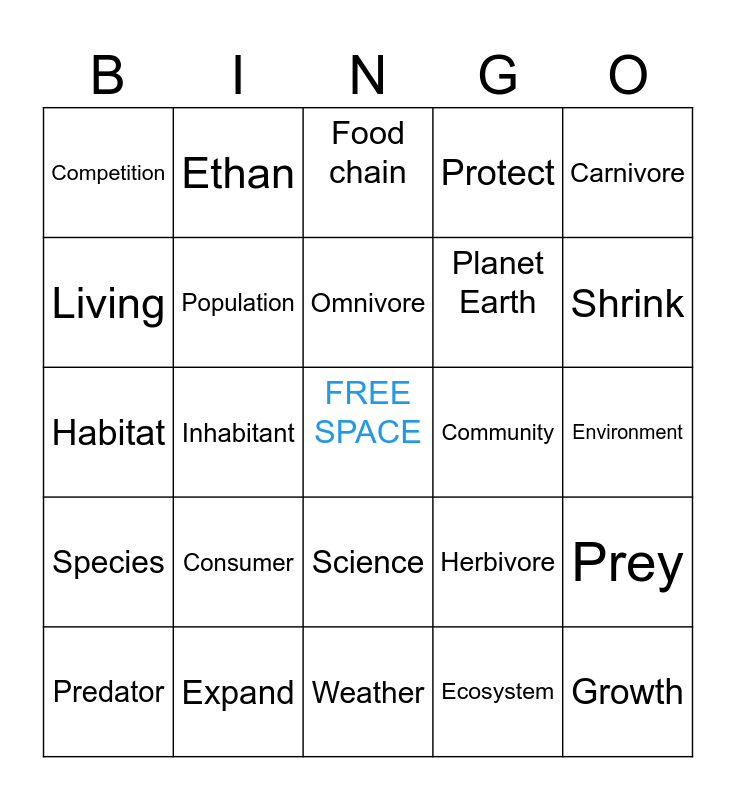 This bingo card has a free space and 24 words: Consumer, Expand, Omnivore, Predator, Carnivore, Competition, Living, Ethan, Community, Science, Planet Earth, Habitat, Herbivore, Prey, Population, Ecosystem, Environment, Food chain, Shrink, Inhabitant, Growth, Species, Protect and Weather.