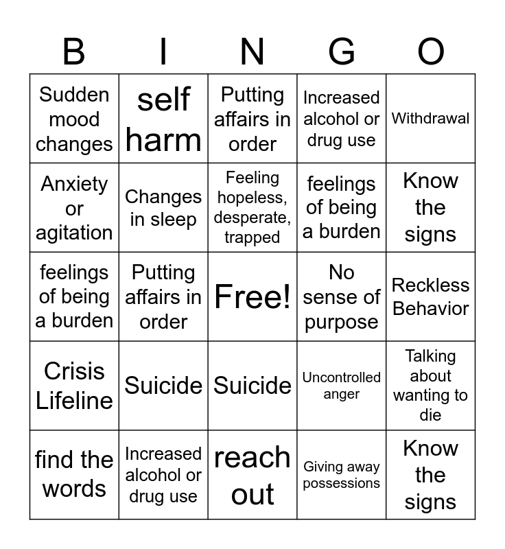 Depression Bingo! | Suicide Prevention ; | Signs of Depression | Suicide Prevention - What to Look For | Suicide Prevention - What to Look For