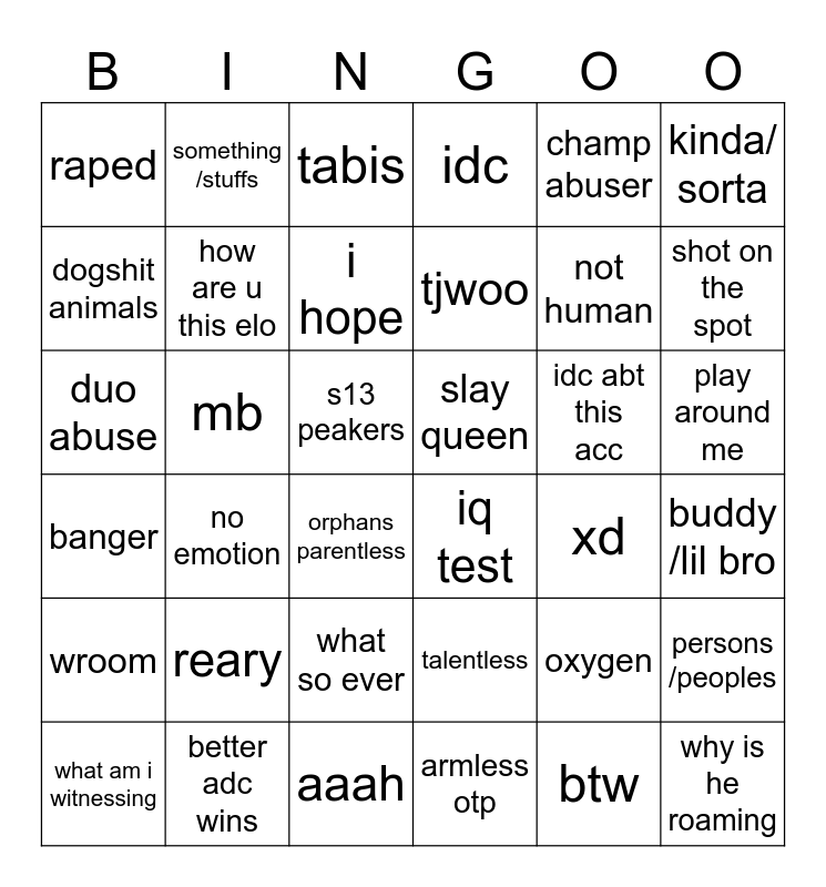 This bingo card has 51 words: whaa?, duo abuse, quick smoke, xd, idc abt this acc, aaah, something /stuffs, pdf, kinda/ sorta, armless otp, dogshit animals, idc, no emotion, banger, open/let me out, oxygen, how are u this elo, mb, naaah, champ abuser, shot on the spot, buddy /lil bro, raped, i hope, get cancer, wroom, tjwoo, fak off, orphans parentless, tabis, lp hungry/ thirsty, persons /peoples, can't win all, low elo, better adc wins, iq test, what so ever, btw, why is he roaming, brain dmg, s13 peakers, slay queen, tutu rutu, hehehe, reary, talentless, not human, what am i witnessing, bazilisks marins disco adriens, play around me and pretty chill.