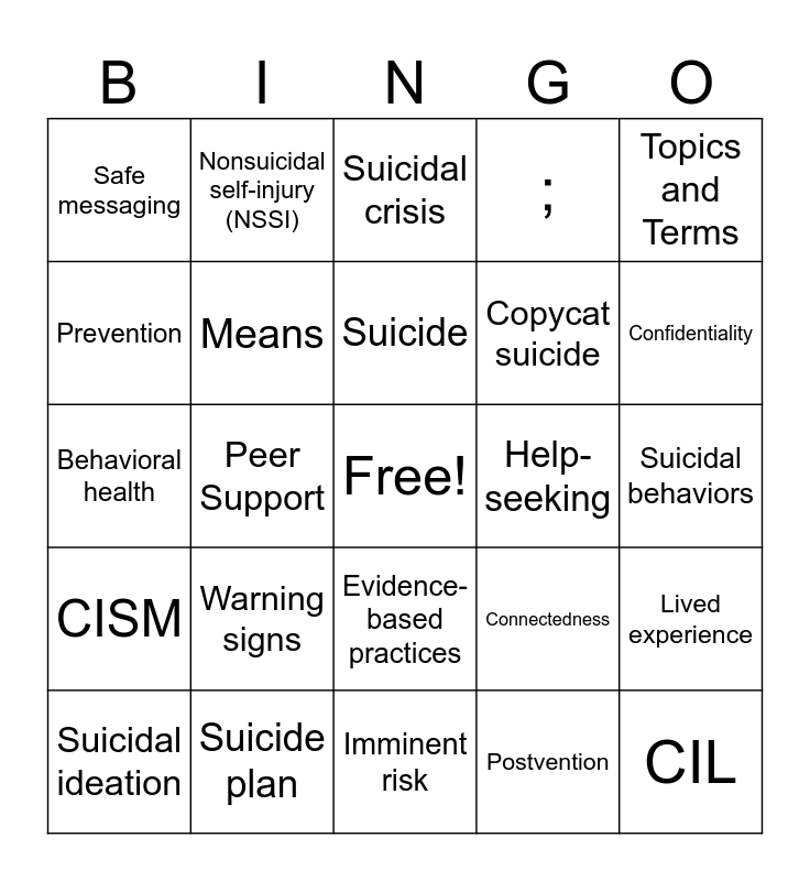 This bingo card has a free space and 24 words: Warning signs, Suicide plan, Suicide, Suicidal ideation, Topics and Terms, Safe messaging, Prevention, Nonsuicidal self-injury (NSSI), Help-seeking, Evidence-based practices, Copycat suicide, Behavioral health, Connectedness, Lived experience, Means, Postvention, Suicidal behaviors, Suicidal crisis, Confidentiality, Peer Support, CIL, CISM, ; and Imminent risk.