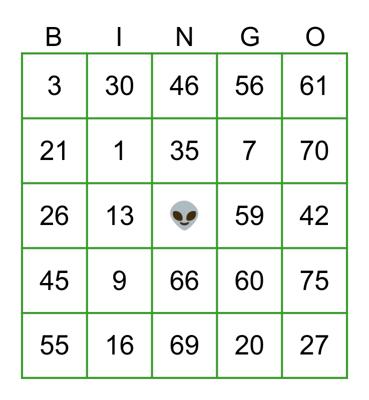 This bingo card has a free space and 24 words: 9, 16, 35, 55, 61, 3, 21, 30, 59, 66, 7, 26, 60, 75, 1, 20, 42, 46, 70, 13, 27, 45, 56 and 69.