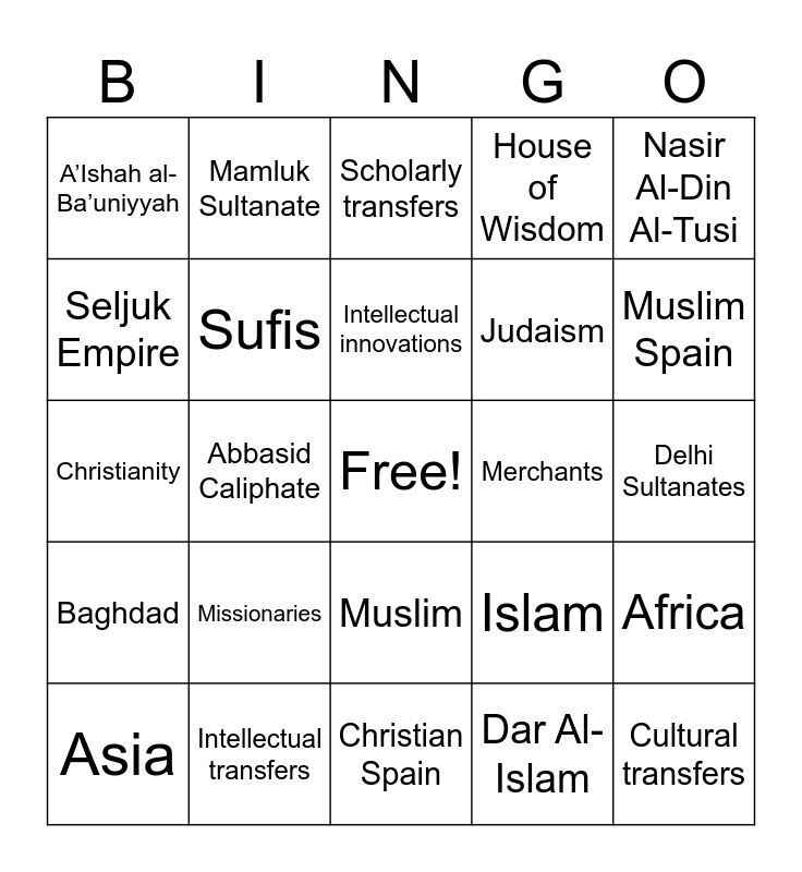 This bingo card has a free space and 26 words: Muslim, Dar Al-Islam, Intellectual innovations, Intellectual transfers, Nasir Al-Din Al-Tusi, A’Ishah al-Ba’uniyyah, Seljuk Empire, Mamluk Sultanate, Delhi Sultanates, Islam, Judaism, Christianity, Africa, Asia, Abbasid Caliphate, Turkic people, House of Wisdom, Baghdad, Scholarly transfers, Cultural transfers, Muslim Spain, Christian Spain, Merchants, Missionaries, Sufis and Medical Advances.
