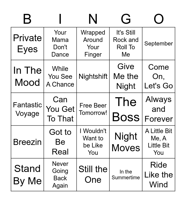This bingo card has a free space and 74 words: Strawberry Letter 23, Rich Girl, Wrapped Around Your Finger, Move On Up, Mexico, San Francisco (Be Sure To Wear Flowers In Your Hair), Between the Sheets, Use Me, Stand By Me, Yearning For Love, Spill The Wine, Careless Whisper, Nightshift, In The Mood, Evil Woman, Can You Get To That, Listen to the Music, Come On, Let's Go, Brown Sugar, Fantastic Voyage, While You See A Chance, Your Mama Don't Dance, It's Still Rock and Roll To Me, For the Love Money, Ride Like the Wind, Baby Hold On, For Once In My Life, Keep Pushin', Sussudio, You Can Call Me Al, September, Somebody's Baby, Goodbye Stranger, Brandy (You're a Fine Girl), Ride Captain Ride, In the Summertime, Rock Your Body, Afternoon Delight, Dancing in the Moonlight, Sugar, Sugar, Still the One, Never Going Back Again, Boogie Nights, I Keep Forgettin' (Everytime You're Near), Rosanna, Private Eyes, Mona Lisas and Mad Hatters, Got to Be Real, Dreadlock Holiday, Baker Street, Sister Golden Hair, Do It Again, Always and Forever, December, 1963, Play The Funky Music, Lido Shuffle, I Wouldn't Want to be Like You, Mrs. Robinson, Wouldn't It Be Nice, A Little Bit Me, A Little Bit You, Give Me the Night, Set Me Free, Breezin, Stomp!, The Boss, Yearning For Your Love, Rhythm of The Night, Summer in the City, Night Moves, Love You Inside Out, I Was Born to Love You, Africa, Dreams and Easy Lover.