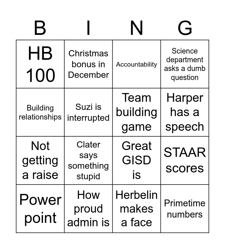 This bingo card has 16 words: How proud admin is, STAAR scores, Accountability, HB 100, Not getting a raise, Christmas bonus in December, Great GISD is, Herbelin makes a face, Building relationships, Suzi is interrupted, Power point, Science department asks a dumb question, Clater says something stupid, Harper has a speech, Team building game and Primetime numbers.