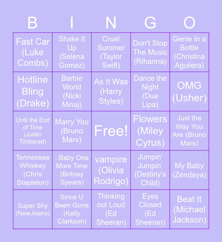 This bingo card has a free space and 30 words: Since U Been Gone (Kelly Clarkson), Lips Are Movin (Meghan Trainor), Marry You (Bruno Mars), Watermelon Sugar (Harry Styles), Fast Car (Luke Combs), Cruel Summer (Taylor Swift), Barbie World (Nicki Minaj), vampire (Olivia Rodrigo), Flowers (Miley Cyrus), Thinking out Loud (Ed Sheeran), Just the Way You Are (Bruno Mars), Beat It (Michael Jackson), Eyes Closed (Ed Sheeran), Heaven Can Wait (Michael Jackson), OMG (Usher), Umbrella (Rihanna), Jumpin’ Jumpin’ (Destiny's Child), Tennessee Whiskey (Chris Stapleton), ..Baby One More Time (Britney Spears), Genie In a Bottle (Christina Aguilera), Until the End of Time (Justin Timbered), Pon de Replay (Rihanna), Shake It Up (Selena Gomez), Dance the Night (Dua Lipa), Hotline Bling (Drake), Don't Stop The Music (Rihanna), My Baby (Zendaya), Super Shy (NewJeans), As It Was (Harry Styles) and Boy’s a Liar (PinkPantheresss).