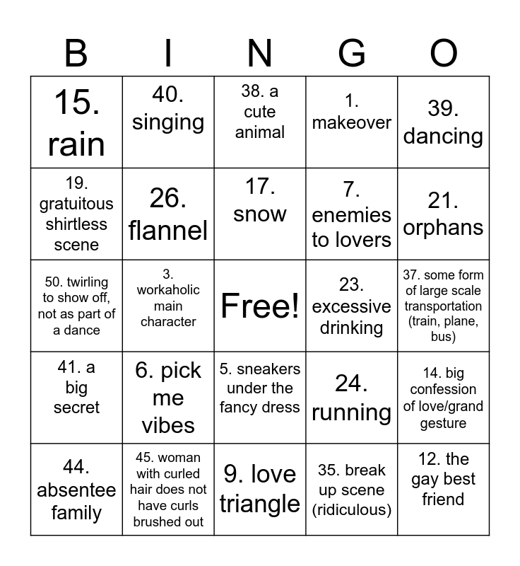 This bingo card has a free space and 24 words: 6. pick me vibes, 45. woman with curled hair does not have curls brushed out, 17. snow, 44. absentee family, 39. dancing, 15. rain, 19. gratuitous shirtless scene, 40. singing, 23. excessive drinking, 5. sneakers under the fancy dress, 7. enemies to lovers, 50. twirling to show off, not as part of a dance, 24. running, 14. big confession of love/grand gesture, 26. flannel, 35. break up scene (ridiculous), 37. some form of large scale transportation (train, plane, bus), 38. a cute animal, 21. orphans, 3. workaholic main character, 12. the gay best friend, 41. a big secret, 1. makeover and 9. love triangle.