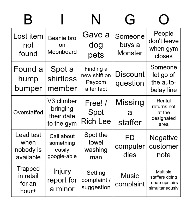 This bingo card has a free space and 24 words: Call about something easily google-able, Injury report for a minor, Finding a new shift on Paycom after fact, Trapped in retail for an hour+, People don't leave when gym closes, Lost item not found, Found a hump bumper, Beanie bro on Moonboard, Missing a staffer, Spot the towel washing man, Discount question, Overstaffed, FD computer dies, Negative customer note, Spot a shirtless member, Music complaint, Rental returns not at the designated area, Gave a dog pets, Someone let go of the auto-belay line, V3 climber bringing their date to the gym, Multiple staffers doing rehab upstairs simultaneously, Lead test when nobody is available, Someone buys a Monster and Setting complaint / suggestion.