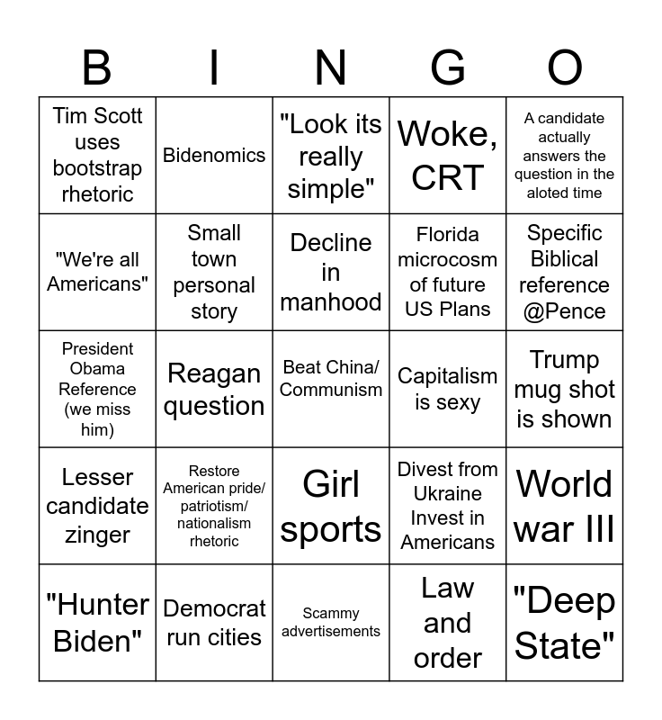 This bingo card has a free space and 39 words: Ramaswamy refers to other candidates as robots/ reciting talking points, Nikki Haley uses the girl power card, The border between racism and anti immigration is crossed, Small town personal story, "Hunter Biden", Girl sports, Decline in manhood, Candidate rejects the premise of a question (@Desantis), A candidate actually answers the question in the aloted time, Lesser candidate zinger, Reagan question, Woke, CRT, "Deep State", Trump mug shot is shown, Capitalism is sexy, Restore American pride/ patriotism/ nationalism rhetoric, Candidates refer to their children / "the world we're leaving our children.", Tim Scott uses bootstrap rhetoric, Ramaswamy unhinged foreign policy, Divest from Ukraine Invest in Americans, "We're all Americans", Scammy advertisements, Florida microcosm of future US Plans, Specific Biblical reference @Pence, Trump Christie Brawl, Vivek giant Trump fanboy, Hand raising segment, Silly hand gesture, Poll number shaming, Bidenomics, RINOs, Support for slashing public services, "Look its really simple", Democrat run cities, Law and order, Election was stolen, World war III, President Obama Reference (we miss him) and pop culture refernce.