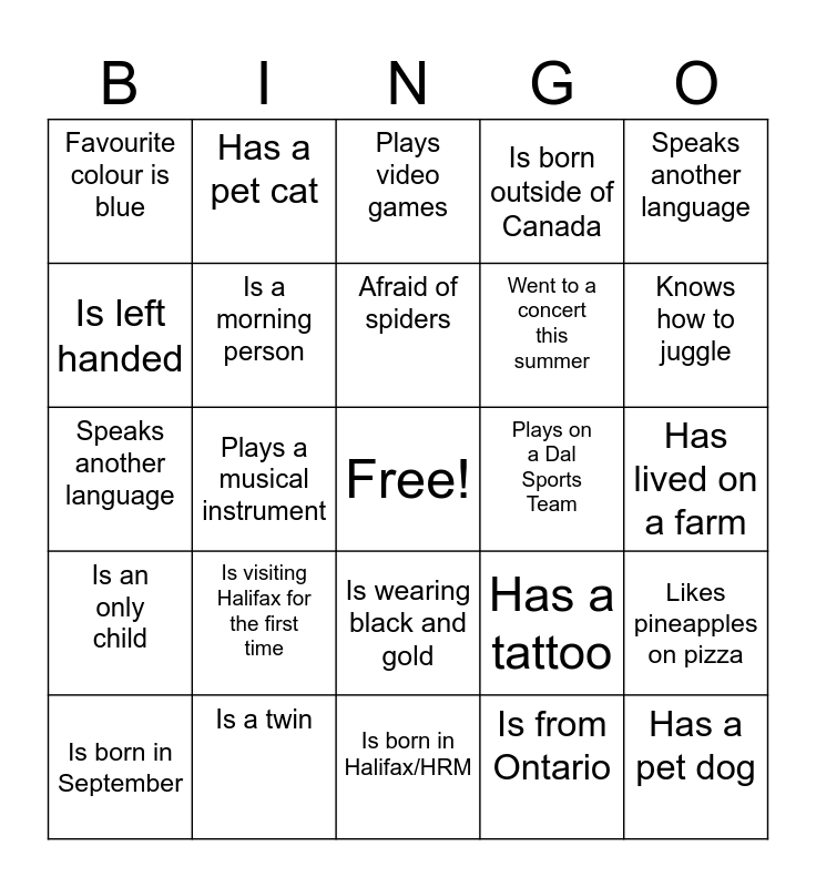 This bingo card has a free space and 24 words: Is visiting Halifax for the first time, Is a twin, Afraid of spiders, Is born in September, Speaks another language, Favourite colour is blue, Is left handed, Has a pet cat, Plays on a Dal Sports Team, Is wearing black and gold, Went to a concert this summer, Speaks another language, Has a tattoo, Likes pineapples on pizza, Is a morning person, Is from Ontario, Has lived on a farm, Plays video games, Knows how to juggle, Plays a musical instrument, Has a pet dog, Is an only child, Is born outside of Canada and Is born in Halifax/HRM.