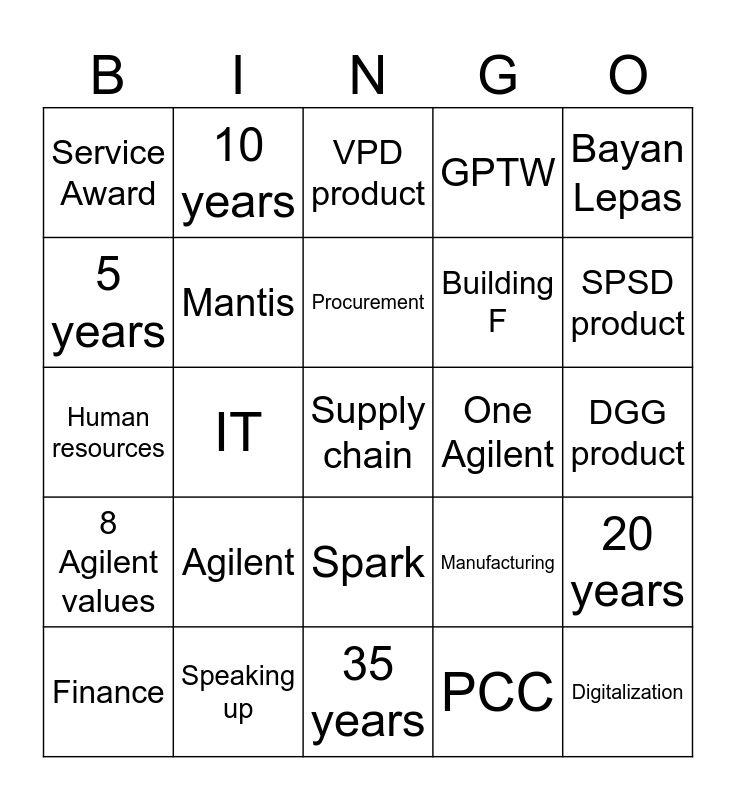 This bingo card has 25 words: Agilent, 35 years, Procurement, Finance, Bayan Lepas, Service Award, 5 years, 10 years, One Agilent, Spark, Building F, Human resources, Manufacturing, 20 years, Mantis, Digitalization, DGG product, VPD product, SPSD product, IT, Supply chain, Speaking up, 8 Agilent values, GPTW and PCC.