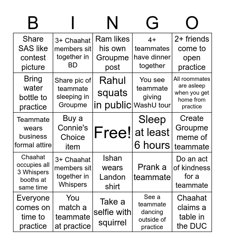 This bingo card has a free space and 24 words: 3+ Chaahat members sit together in Whispers, You match a teammate at practice, Rahul squats in public, Everyone comes on time to practice, 2+ friends come to open practice, Share SAS like contest picture, Bring water bottle to practice, 3+ Chaahat members sit together in BD, Sleep at least 6 hours, Ishan wears Landon shirt, You see teammate giving WashU tour, Teammate wears business formal attire, Prank a teammate, Do an act of kindness for a teammate, Share pic of teammate sleeping in Groupme, See a teammate dancing outside of practice, Create Groupme meme of teammate, Ram likes his own Groupme post, All roommates are asleep when you get home from practice, Buy a Connie's Choice item, Chaahat claims a table in the DUC, Chaahat occupies all 3 Whispers booths at same time, 4+ teammates have dinner together and Take a selfie with squirrel.