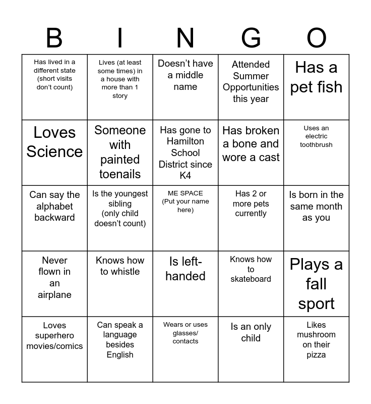 This bingo card has a free space and 29 words: Loves superhero movies/comics, Has a winter B-day (Dec, Jan, Feb), Is the youngest sibling (only child doesn’t count), Can curl their tongue, Has lived in a different state (short visits don’t count), Doesn’t have a middle name, Someone with painted toenails, Knows how to whistle, Has 2 or more pets currently, Can speak a language besides English, Is born in the same month as you, Likes mushroom on their pizza, Wears or uses glasses/ contacts, Is an only child, Uses an electric toothbrush, Read 3 or more books over summer, Is left-handed, Never flown in an airplane, Has a pet fish, Can say the alphabet backward, Knows how to skateboard, Loves Math, Has broken a bone and wore a cast, Loves Science, Attended Summer Opportunities this year, Lives (at least some times) in a house with more than 1 story, Plays a fall sport, Has gone to Hamilton School District since K4 and Has a fall B-day (September, October, November).