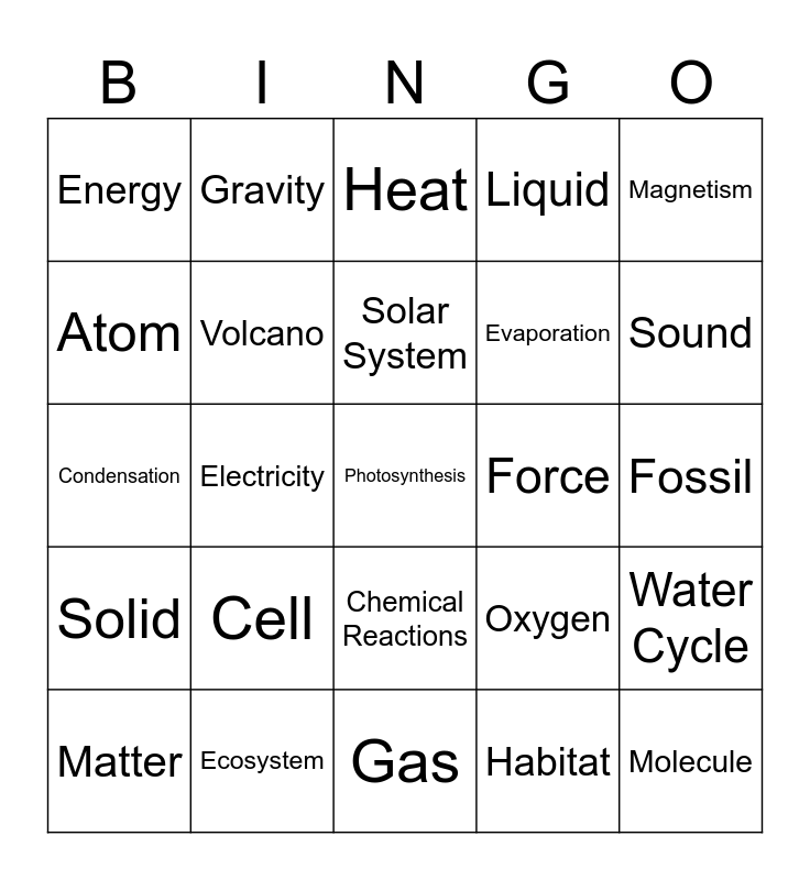This bingo card has a free space and 24 words: Cell, Ecosystem, Solar System, Matter, Magnetism, Energy, Atom, Gravity, Force, Chemical Reactions, Evaporation, Condensation, Oxygen, Water Cycle, Volcano, Habitat, Fossil, Heat, Sound, Electricity, Molecule, Solid, Liquid and Gas.