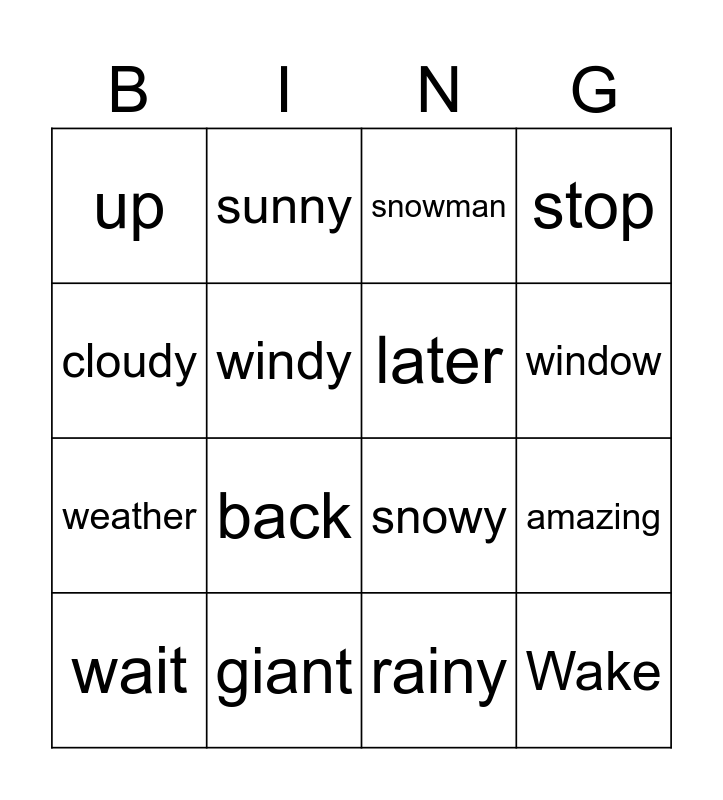 This bingo card has 16 words: giant, amazing, snowman, up, weather, sunny, snowy, rainy, cloudy, windy, wait, stop, back, window, later and Wake.