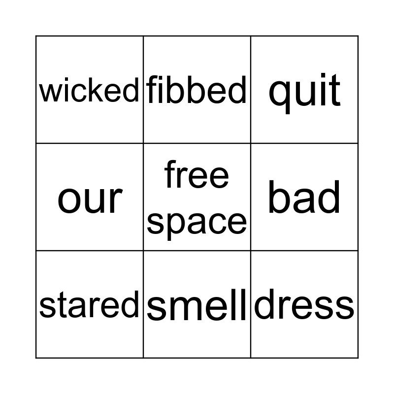 This bingo card has a free space and 8 words: bad, quit, fibbed, stared, wicked, dress, our and smell.