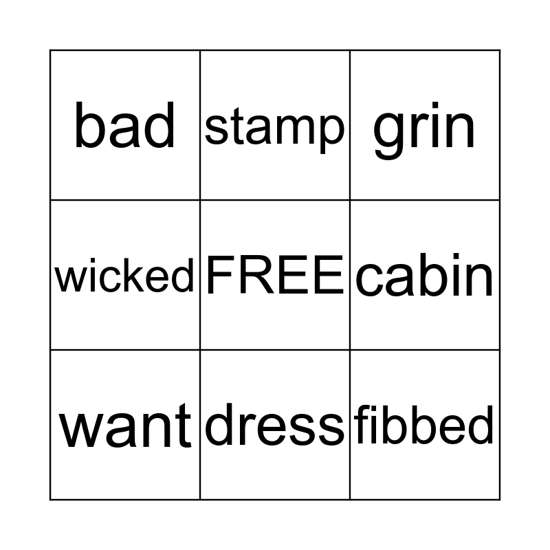 This bingo card has a free space and 8 words: cabin, grin, stamp, want, bad, fibbed, wicked and dress.