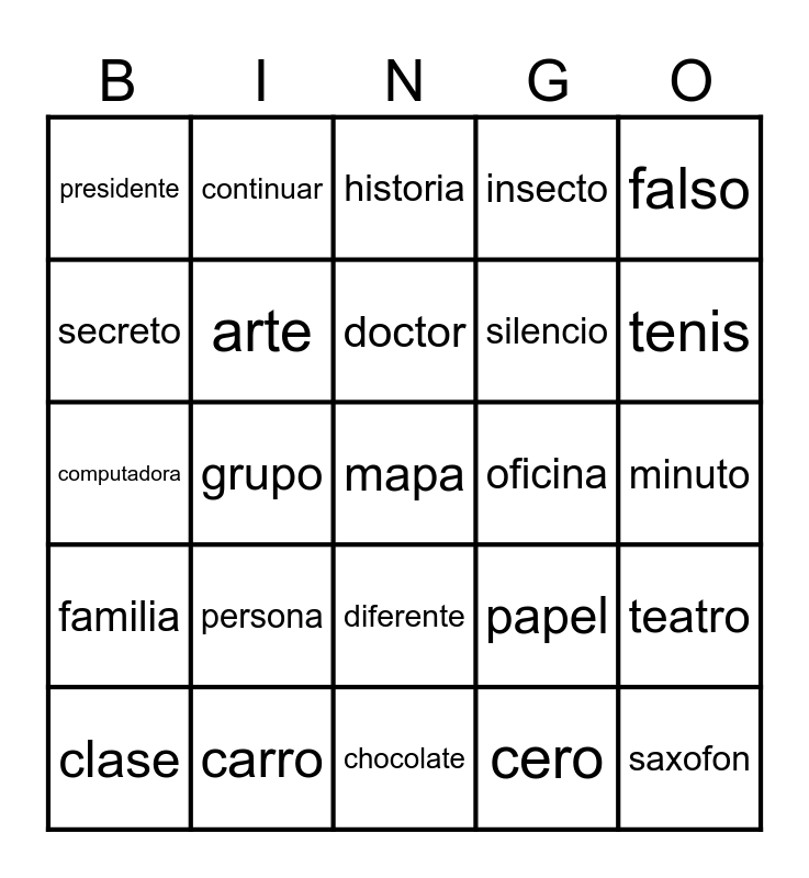 This bingo card has 40 words: Free!, computadora, animal, arte, carro, diferente, doctor, excelente, falso, familia, grupo, insecto, mapa, minuto, oficina, persona, perfecto, presidente, serio, historia, teatro, cero, silencio, secreto, idea, dólar, pizza, piano, saxofon, bús, animal, clase, lapíz, papel, tenis, chocolate, observar, participar, continuar and salsa.