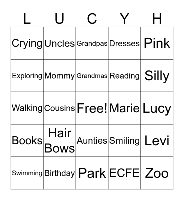This bingo card has a free space and 32 words: ECFE, Diapers, Cousins, Hermes, Books, Mommy, Pink, Levi, Uncles, Daddy, Grandmas, Grandpas, Crawling, Crib, Marie, Toys, Swimming, Walking, Aunties, Hair Bows, Smiling, Fun, Lucy, Birthday, Zoo, Dresses, Reading, Exploring, Crying, Park, Games and Silly.