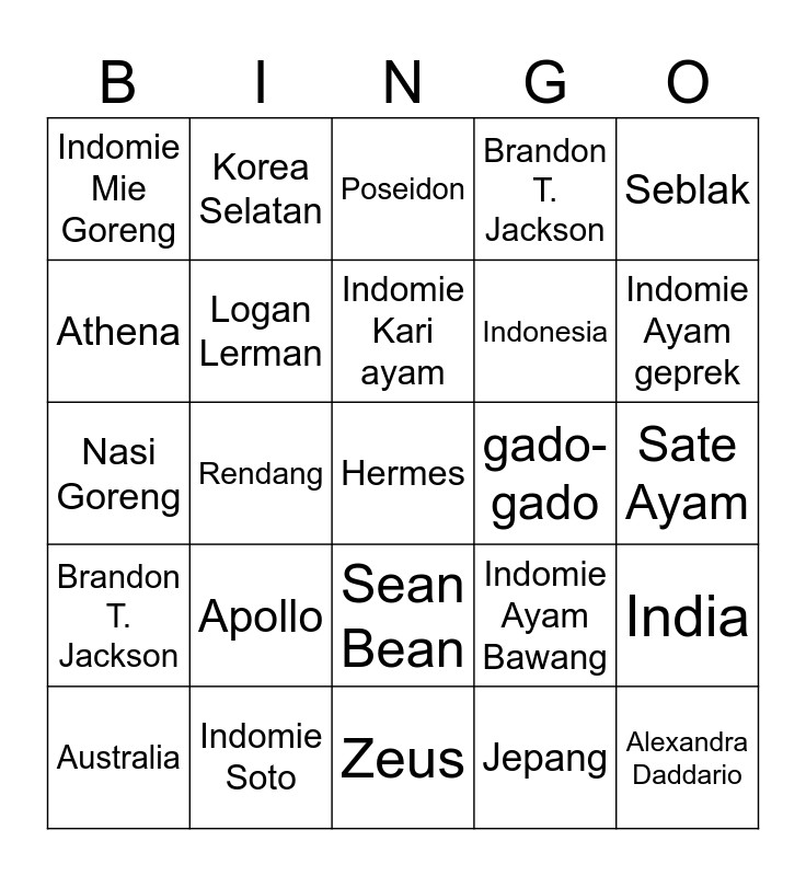 This bingo card has a free space and 24 words: Apollo, Indomie Soto, Indomie Kari ayam, Australia, Seblak, Indomie Mie Goreng, Athena, Korea Selatan, gado-gado, Sean Bean, Indonesia, Nasi Goreng, Indomie Ayam Bawang, India, Logan Lerman, Jepang, Sate Ayam, Poseidon, Indomie Ayam geprek, Rendang, Alexandra Daddario, Brandon T. Jackson, Brandon T. Jackson and Zeus.