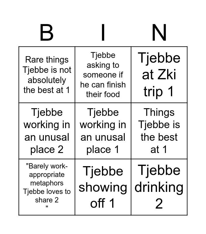 This bingo card has a free space and 11 words: Tjebbe patiently awaiting food, Tjebbe showing off 1, Tjebbe drinking 2, "Barely work-appropriate metaphors Tjebbe loves to share 2 ", Tjebbe asking to someone if he can finish their food, Tjebbe at Zki trip 1, Things Tjebbe is the best at 1, Tjebbe in food bliss, Tjebbe working in an unusal place 2, Rare things Tjebbe is not absolutely the best at 1 and "Barely work-appropriate metaphors Tjebbe loves to share 1 ".
