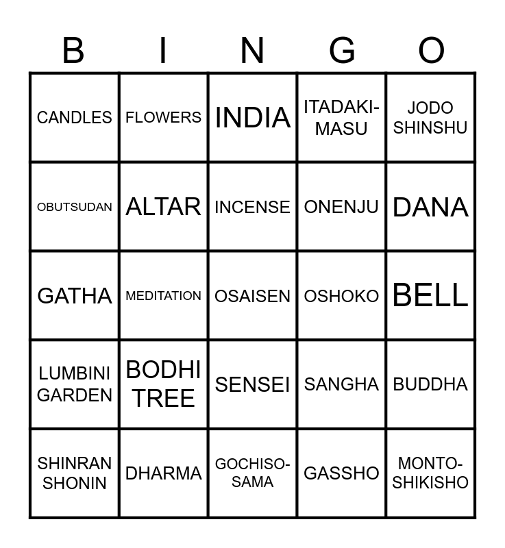 This bingo card has a free space and 24 words: BODHI TREE, DHARMA, INCENSE, SHINRAN SHONIN, JODO SHINSHU, CANDLES, OBUTSUDAN, FLOWERS, OSHOKO, SENSEI, ONENJU, GATHA, SANGHA, BUDDHA, ALTAR, GASSHO, BELL, INDIA, DANA, MEDITATION, MONTO-SHIKISHO, LUMBINI GARDEN, ITADAKI- MASU and GOCHISO-SAMA.