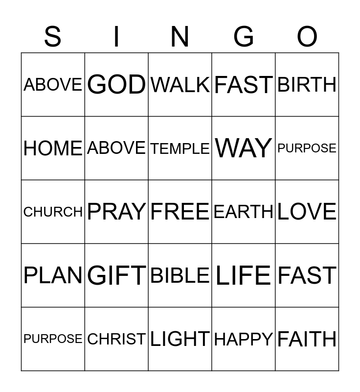 This bingo card has a free space and 24 words: GIFT, CHRIST, TEMPLE, PURPOSE, BIRTH, ABOVE, HOME, GOD, EARTH, BIBLE, WAY, CHURCH, LIFE, FAST, ABOVE, HAPPY, LOVE, WALK, PURPOSE, PRAY, FAITH, PLAN, FAST and LIGHT.